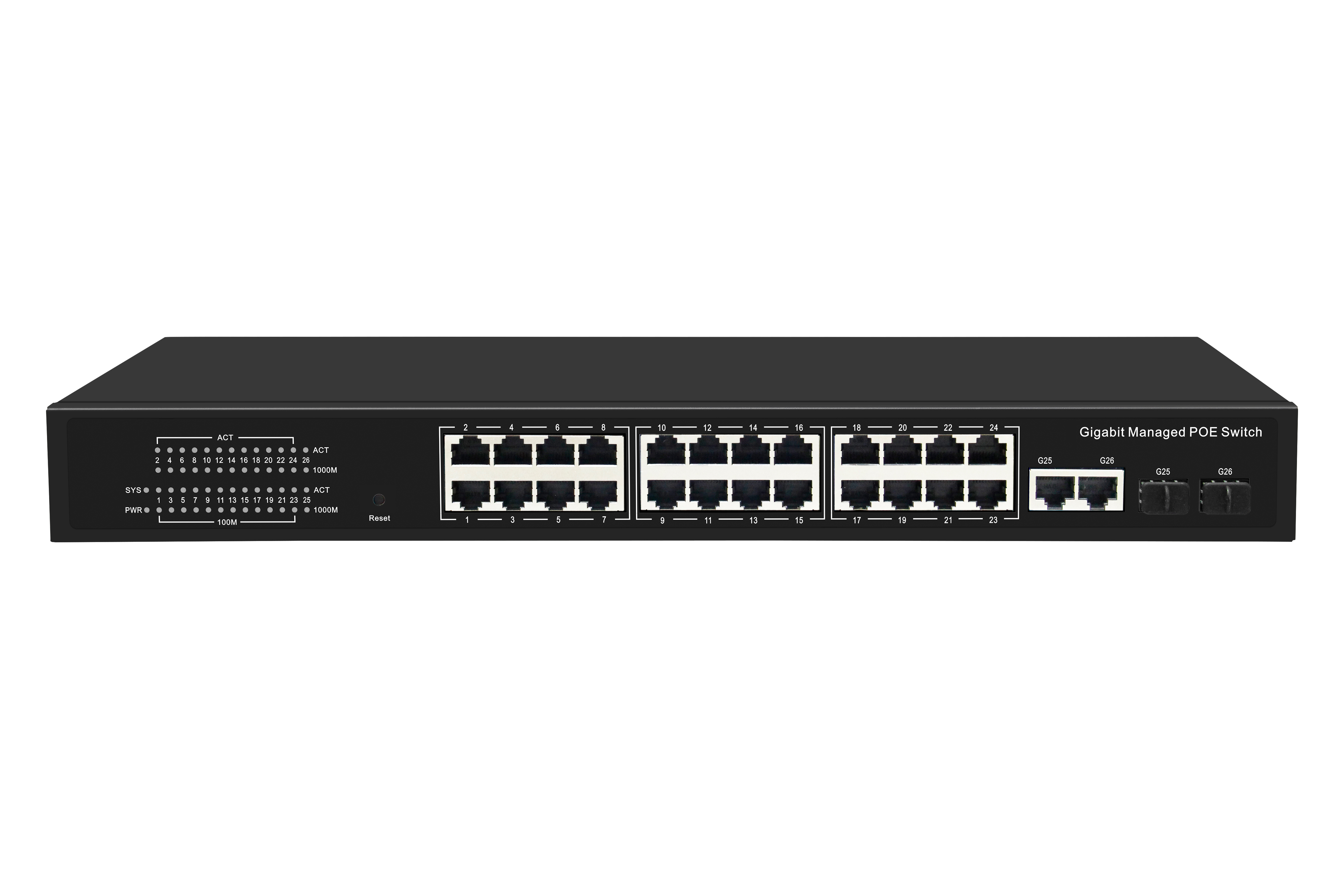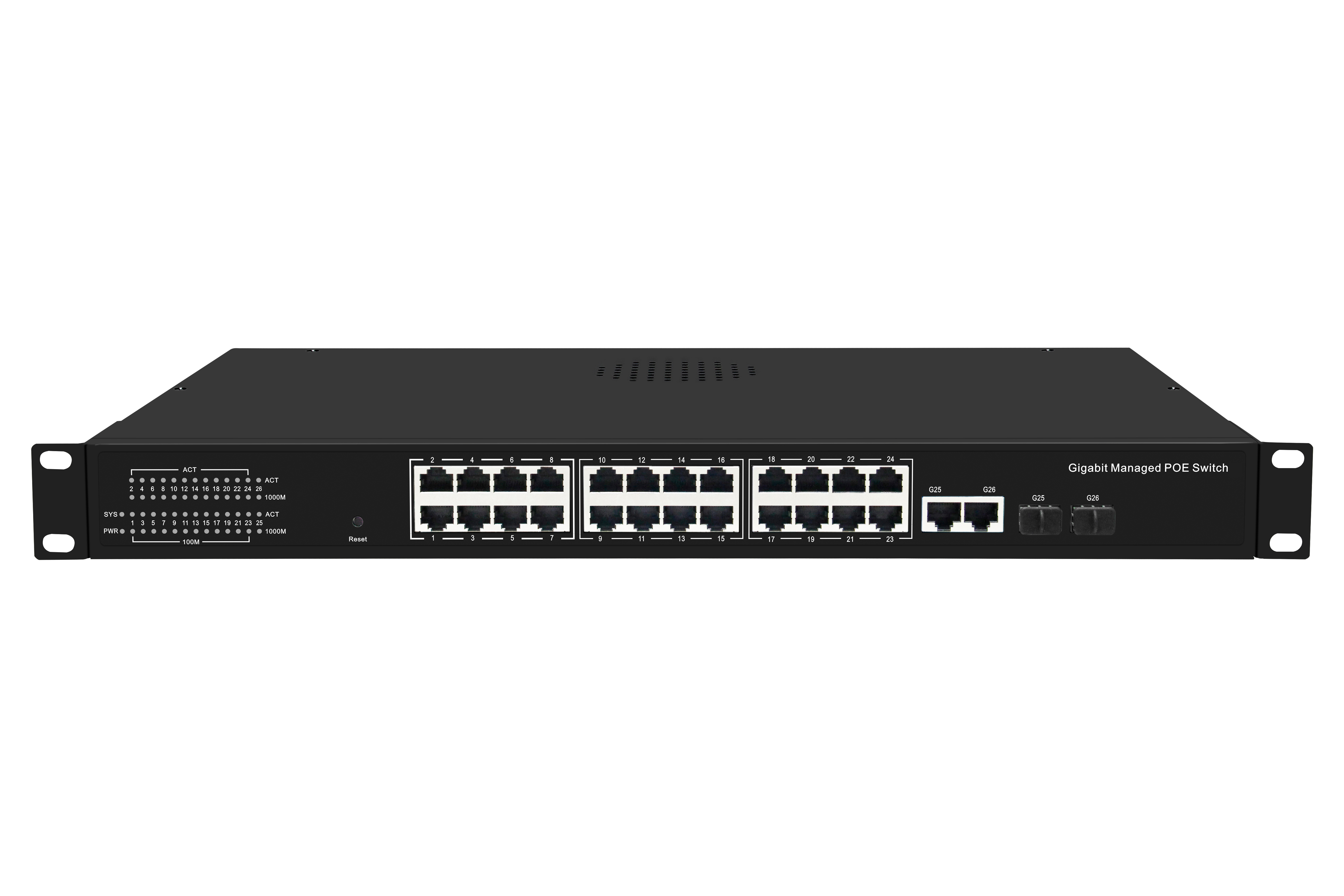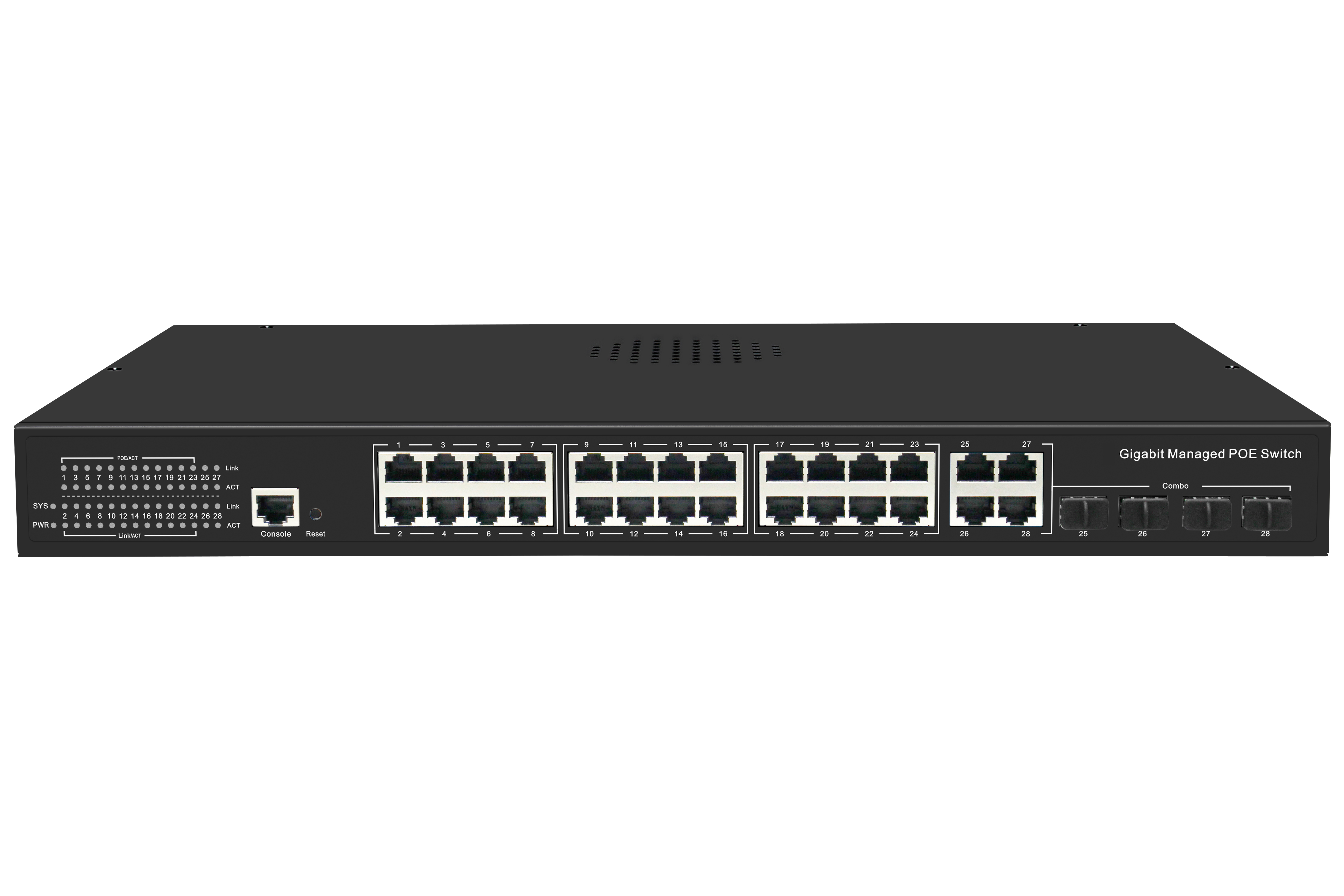 24個千兆PoE網(wǎng)口+8個千兆光電復(fù)用SFP口+ 4個萬兆SFP光口+1個Console網(wǎng)管型商業(yè)級POE交換機
